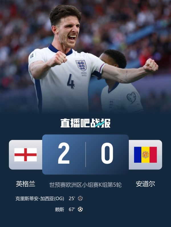 本轮世欧预英格兰2-0击败安道尔马杜埃凯造乌龙,赖斯破门。